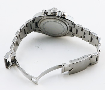 ベゼルにはブラックのアルマイト加工のインサートが施され、タキメーターが時計の表情をより エレガントかつスポーティに演出しています。