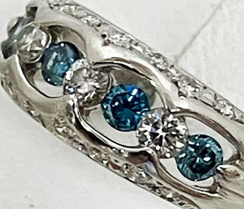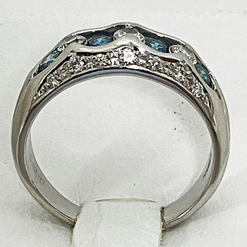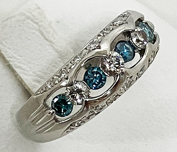 鮮やかな発色のトリートカラーのブルーダイアが、4石セッティングされた華やかなリング
